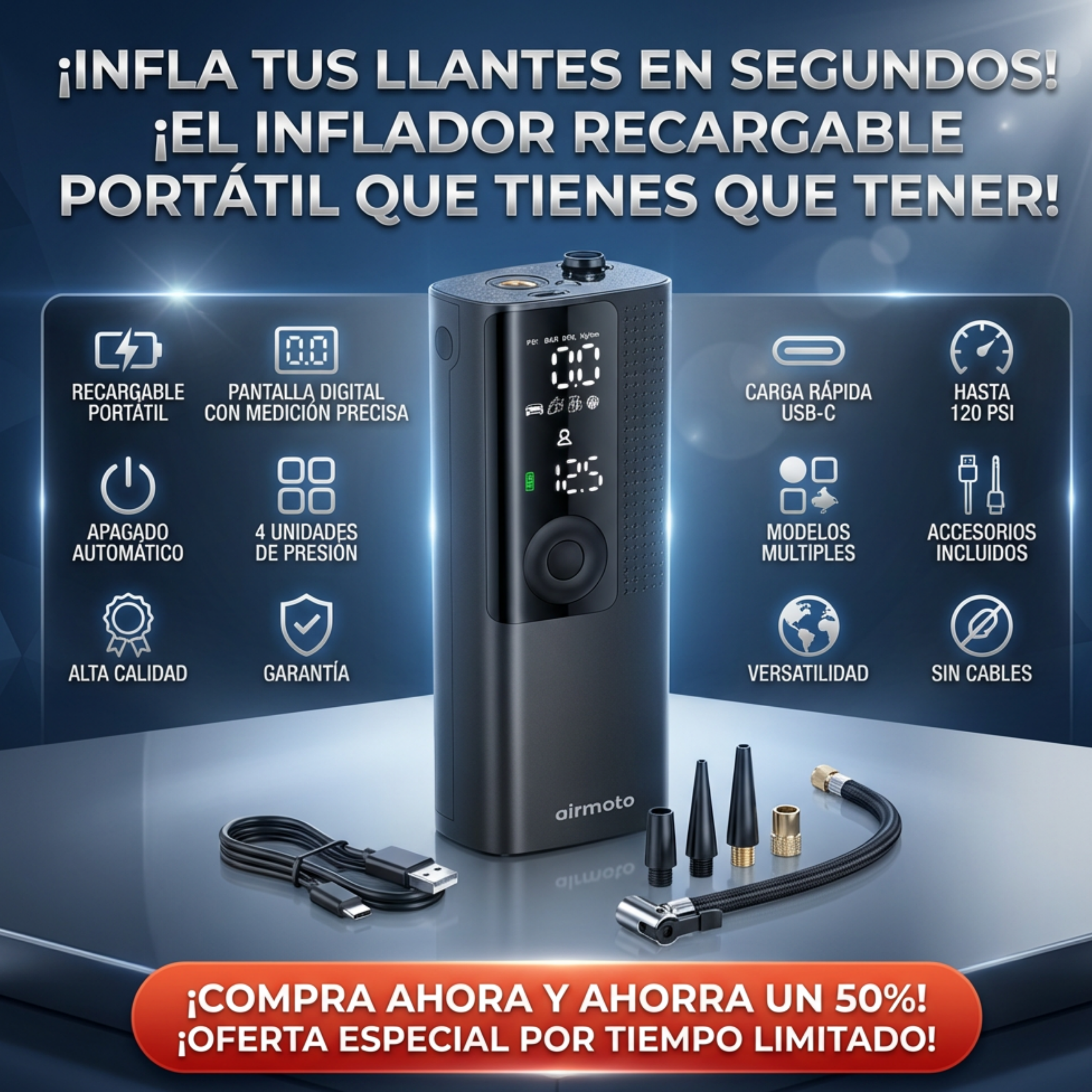 Quedarte con una llanta baja puede arruinar tu día y ponerte en riesgo. El Inflador de Neumáticos Portátil te permite inflar tus llantas rápida y fácilmente, sin cables, sin gasolineras y sin depender de nadie.